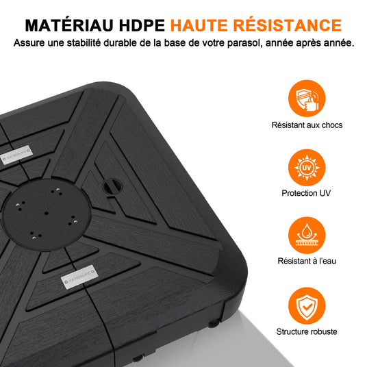 Spécialement conçu pour les grands parasols déportés carrés. Remplissable avec de l’eau ou du sable, le poids du socle peut atteindre 115–200 kg, offrant une stabilité exceptionnelle pour maintenir votre parasol déporté en toute sécurité en extérieur. Idéal pour un mât avec une section de 4,53 x 4,53 po (≈ 11,5 x 11,5 cm), garantissant une compatibilité parfaite et une expérience sans oscillation.