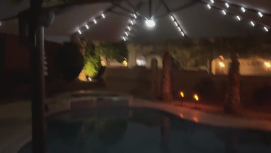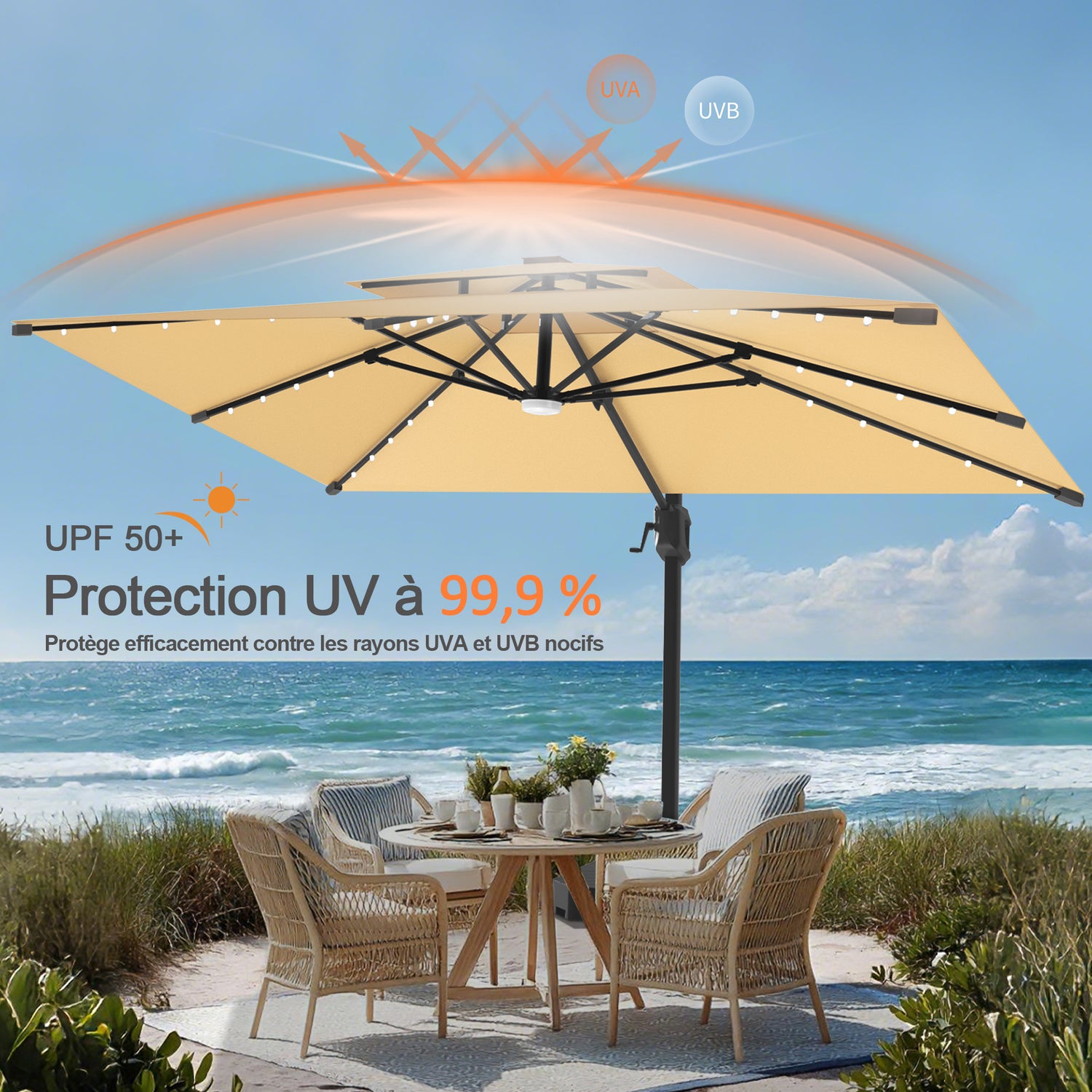 Notre parasol est équipé de 33 lumières LED solaires qui se rechargent pendant la journée et éclairent délicatement vos soirées — une ambiance élégante, sans effort. Allumez-les pour profiter d’une lumière chaude et accueillante, ou laissez-les éteintes pour une atmosphère plus naturelle. Un éclairage éco-responsable qui s’adapte à toutes vos envies.