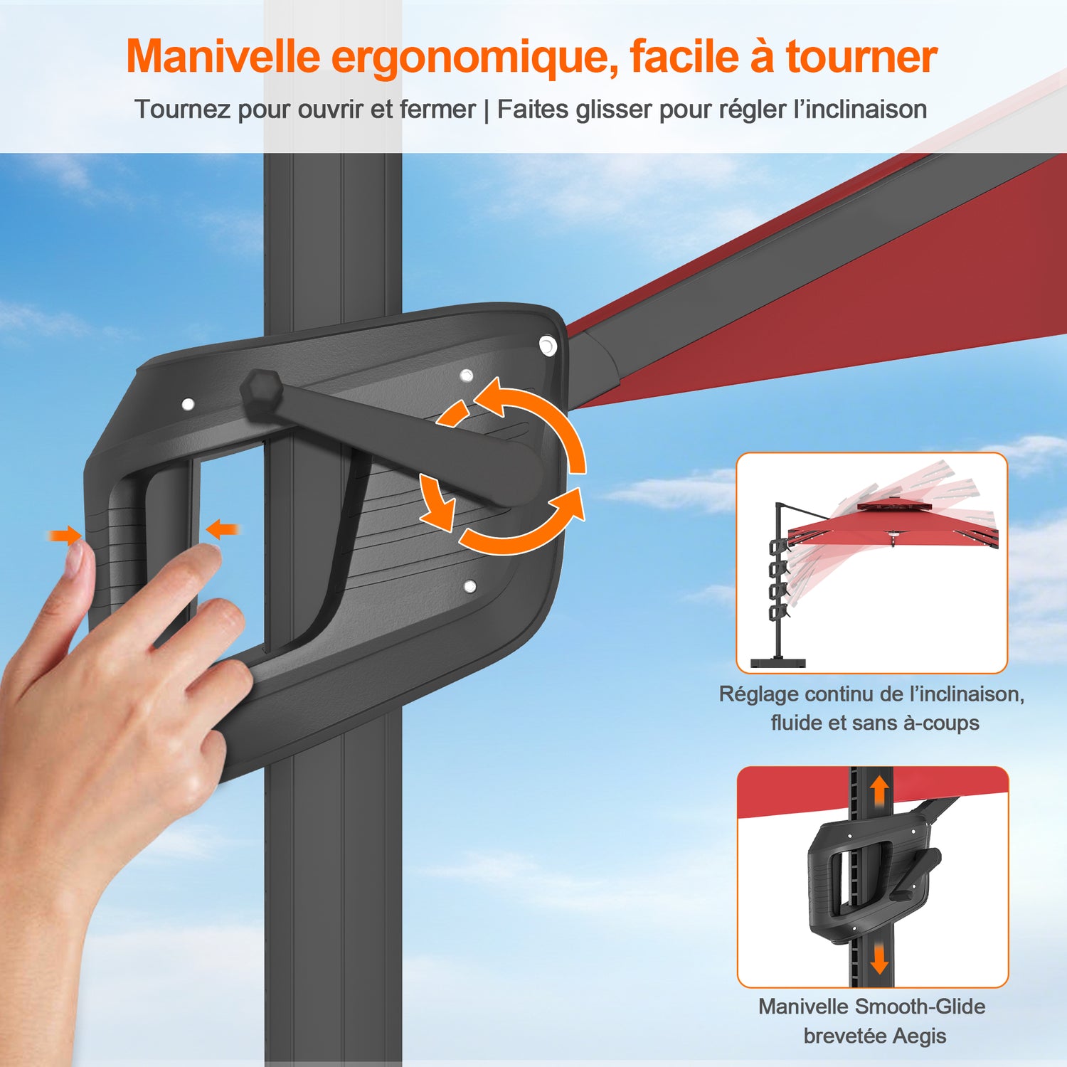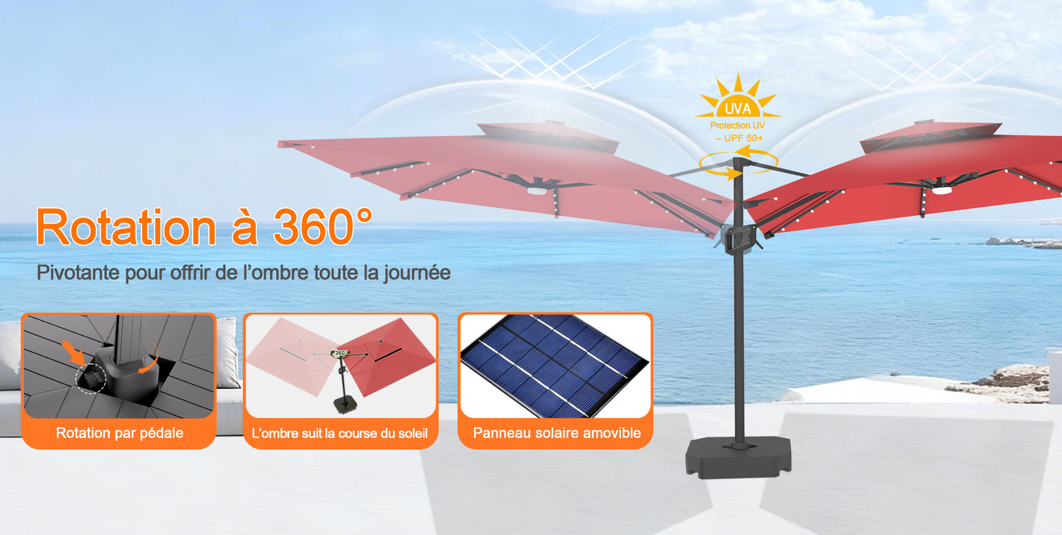 Tournez à 360° avec un simple pédalier et ajustez l'inclinaison pour un confort tout au long de la journée — aucun rayon de soleil n'est hors de portée. Que vous soyez au bord de la piscine, en train d'organiser un brunch ou de vous détendre sur la terrasse, profitez d'une ombre continue exactement là où vous en avez besoin.