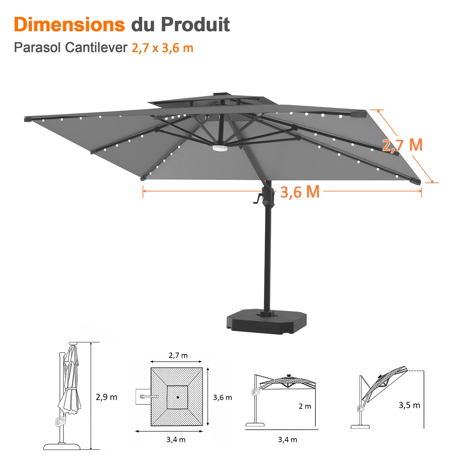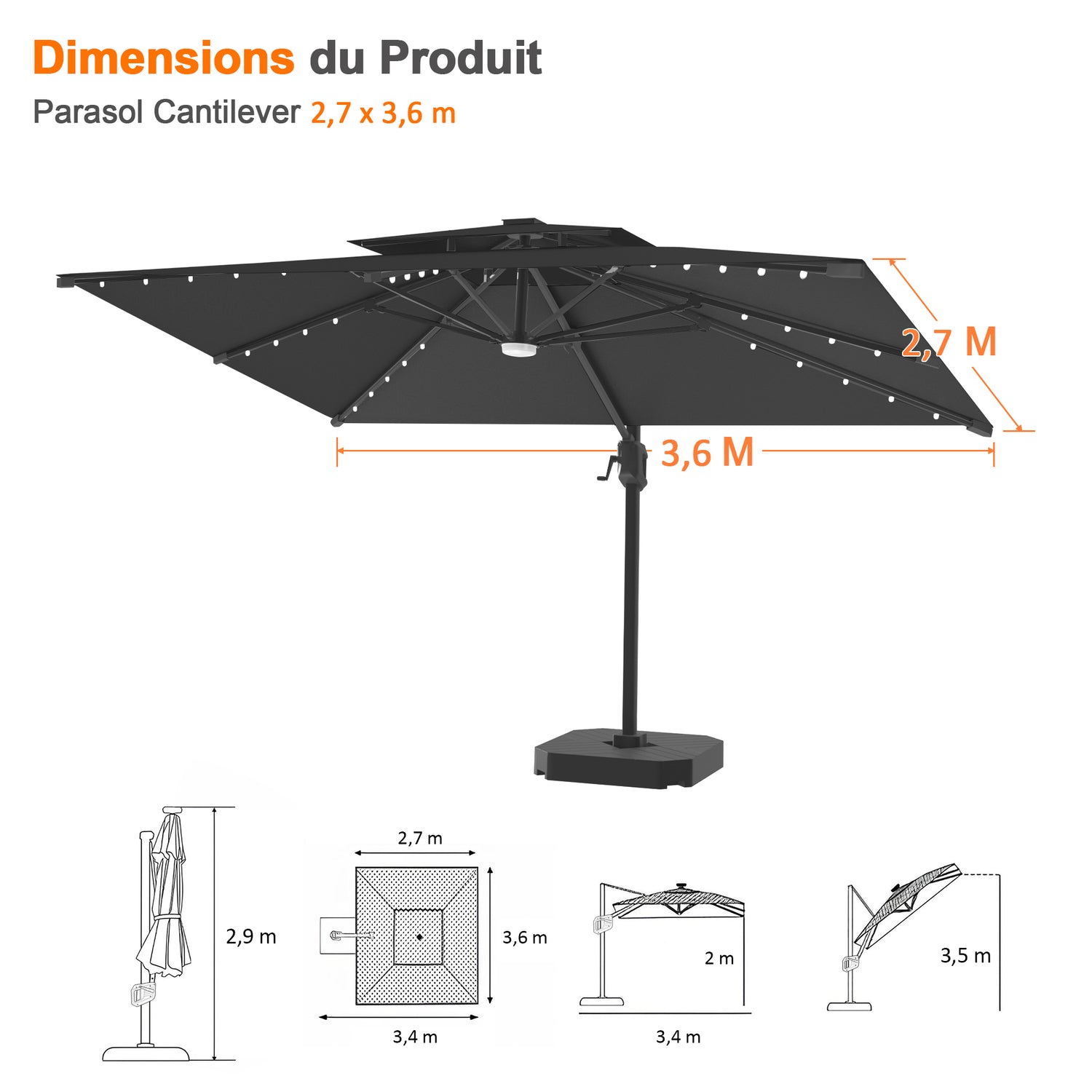 Pour une stabilité, une sécurité et une tranquillité d’esprit optimales, nous vous recommandons vivement notre pack Parasol + Socle. (Voir les détails du socle)