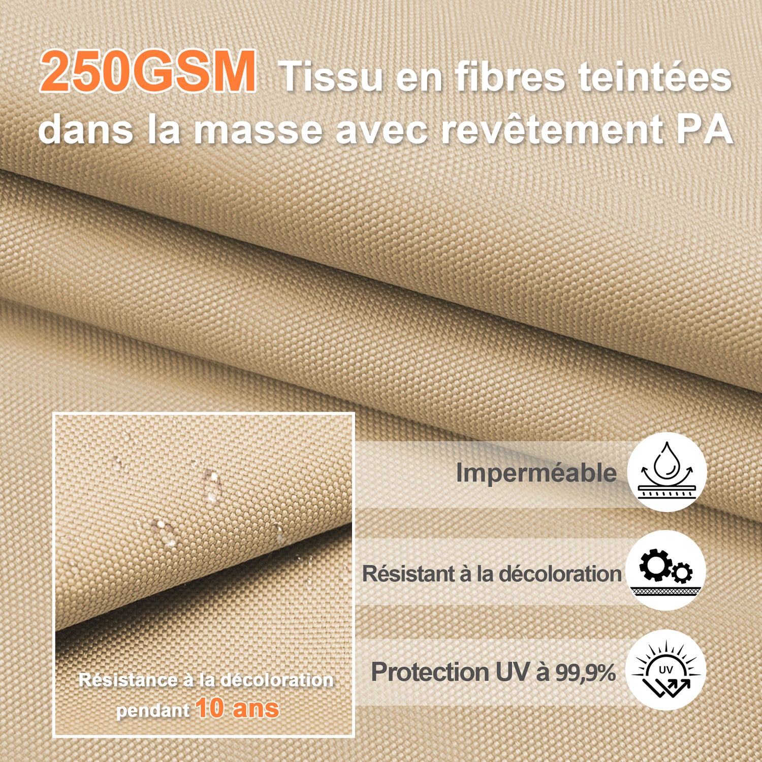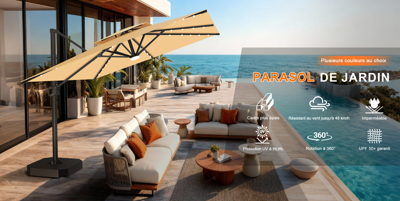 Fabriqué en tissu teint dans la masse de 250 g/m² et renforcé par un revêtement imperméable PA, notre parasol déporté offre une durabilité et une protection contre les intempéries exceptionnelles.Qu'il s'agisse d'un soleil intense ou d'une pluie imprévue, la toile résistante à la décoloration reste performante — garantissant une ombre fiable et un style durable pendant jusqu'à 10 ans d'utilisation en extérieur.Idéale pour la terrasse, le bord de la piscine ou les moments de détente dans le jardin.