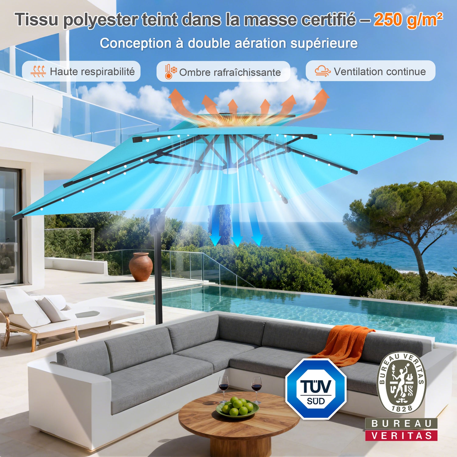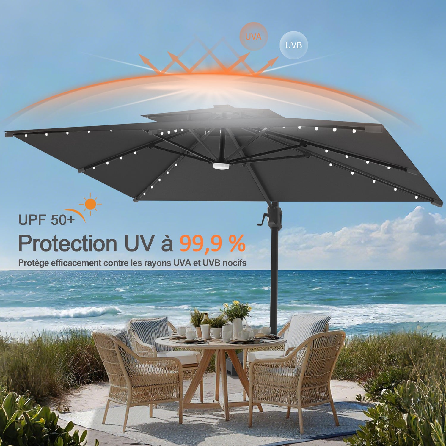Profitez d’un ombrage facile à maîtriser grâce à la rotation à 360° et à l’inclinaison réglable, le tout actionné par une manivelle renforcée pour une manipulation fluide.La toile teintée dans la masse 250 g/m², avec revêtement imperméable, bloque 99,9 % des rayons UV nocifs, résiste à la décoloration et à l’eau, et offre une durée de vie allant jusqu’à 10 ans (contactez‑nous pour consulter le certificat). Un double auvent amélioré favorise la circulation de l’air et augmente la stabilité par temps venteux.