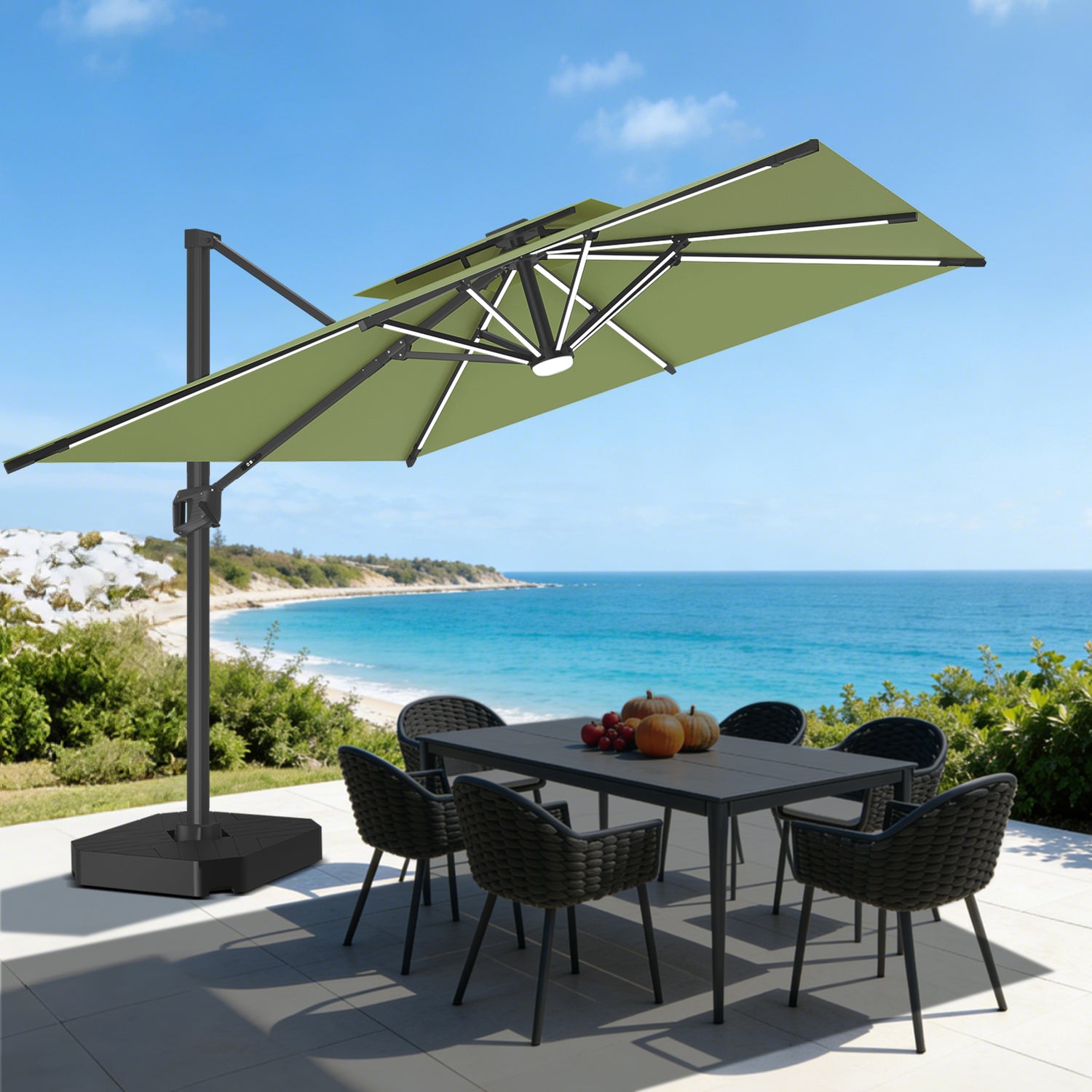 Parasol déporté haut de gamme Patioslife Aegis Pro avec éclairage LED et housse de protection, baleines et mât en aluminium à revêtement thermolaqué — Idéal pour jardins et terrasses