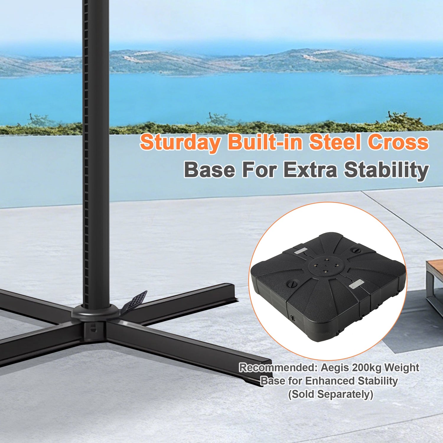 Remarque : chaque parasol est livré avec une base croisée métallique. Pour une stabilité et une sécurité optimales, nous déconseillons l’utilisation de cette base croisée seule. Veuillez acheter une base lestée compatible séparément, ou optez pour notre pack Parasol + Socle lesté sur roulettes — ce pack comprend un socle lesté spécialement conçu avec roulettes, garantissant un maintien sûr de votre parasol tout en permettant un déplacement et un repositionnement faciles.